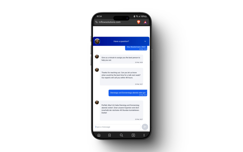 Der Chatbot sammelt auf intelligente Weise wichtige Informationen von Leads – ohne manuellen Aufwand. Diese Daten werden sofort in Ihr CRM-System integriert, sodass Sie nie wieder wichtige Details verlieren und immer bestens informiert sind, wenn Sie weiter mit Ihren Leads arbeiten.